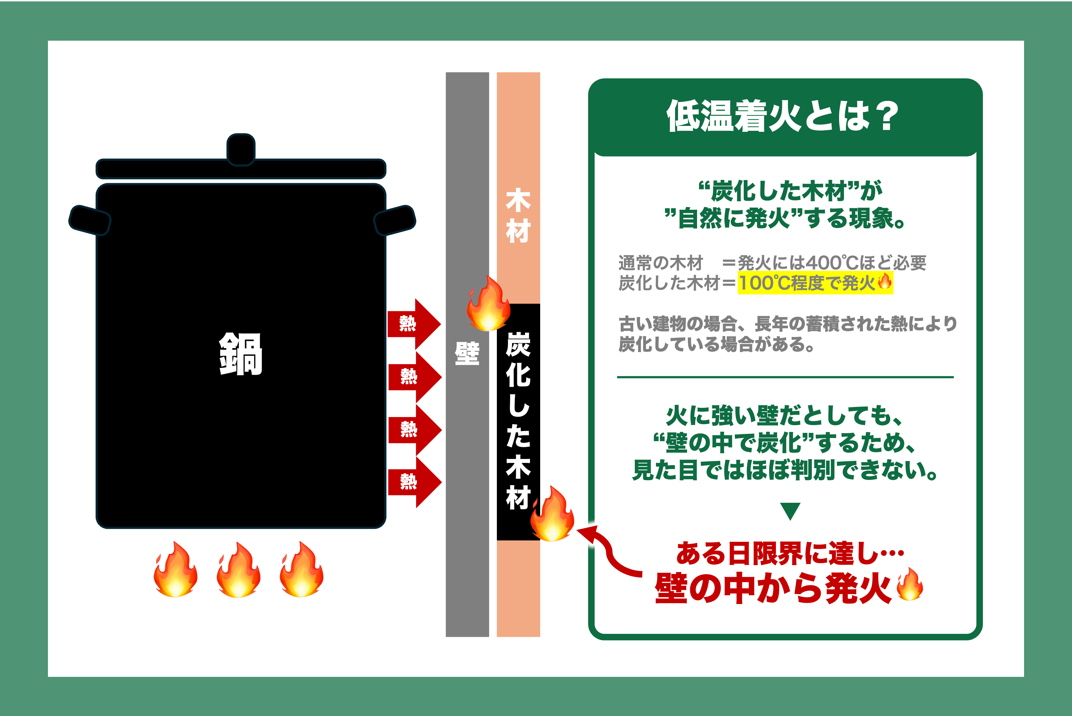 炭化した木材は熱に強い材質で覆った壁の中でも、100度程度で自然に発火してしまうようです。