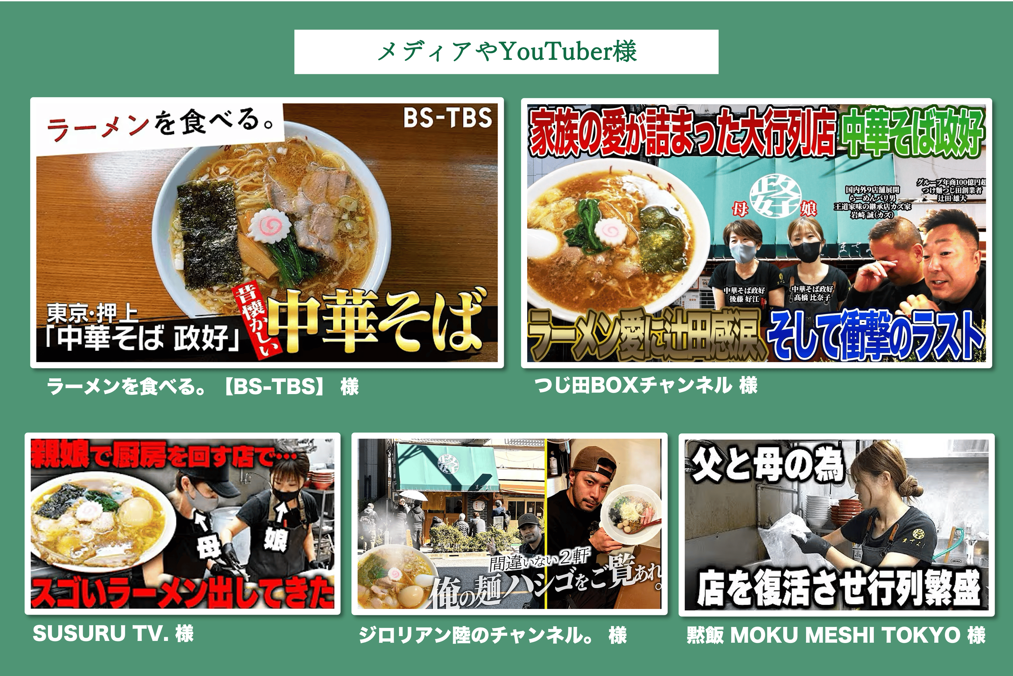 - BS-TBS「ラーメンを食べる。」:#6 中華そば 政好(東京・押上)山下幸輝