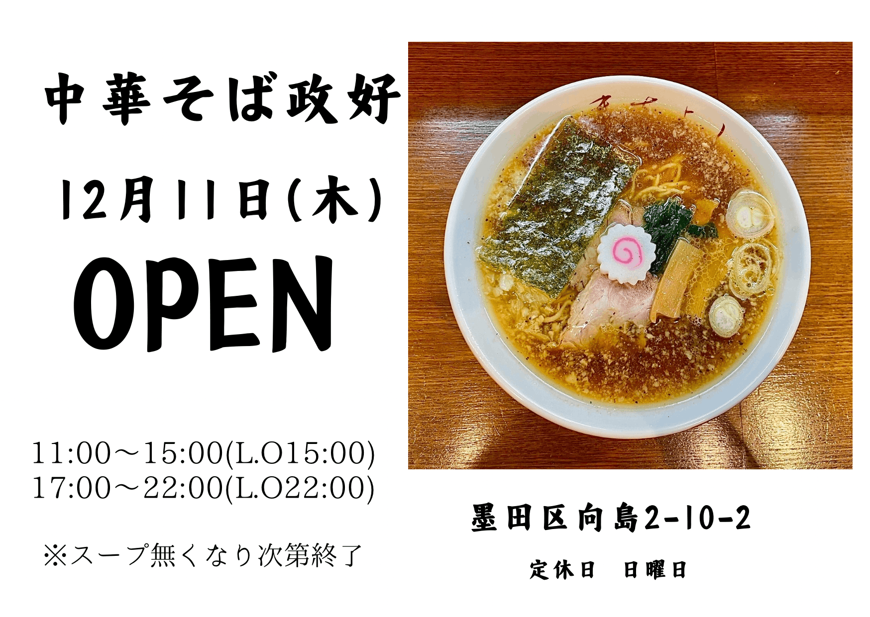 2025/12/03 15:23こんにちは!お久しぶりの更新になり申し訳ありません。再建活動も忙しくなり、開店準備や業者さんとの打ち合わせ、仕入れ、バタバタの毎日を送っております!発生から今日に至るまで、温かいお声掛けやご支援をいただき、どれほど励まされたか計り知れません。皆さまのお力添えがあったからこそ、私たちは再び立ち上がることができました。本当にありがとうございます。この度、慎重な準備を重ね、12月11日(水)より営業を再開できる運びとなりました。12月11日(木)より11時より再開致します!昼の部11:00〜15:00(L.O15:00)夜の部17:00〜22:00(L.O22:00)定休日は日曜日です。昼、夜どちらもスープ無くなり次第終了になります!再開にあたり、改めて安全管理を徹底し、二度と同じことが起きぬよう、より一層気を引き締めて営業してまいります。これからも「政好らしい一杯」をお届けできるよう、スタッフ一同、初心に立ち返り、誠心誠意努めてまいります。無事オープンの日を迎えられるように最終準備頑張りますので、どうぞよろしくお願い致します!!!中華そば政好 スタッフ一同 もっと見る