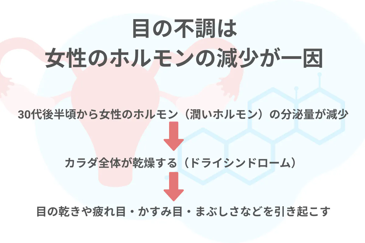 もちろん、目の不調は男性にもある悩みですが、女性はホルモンバランスの影響もあり、特に30代以降はより不調を感じやすいのだそうです。