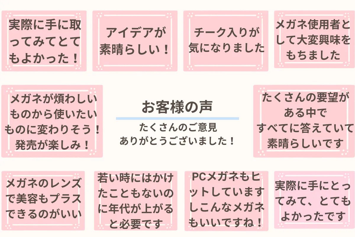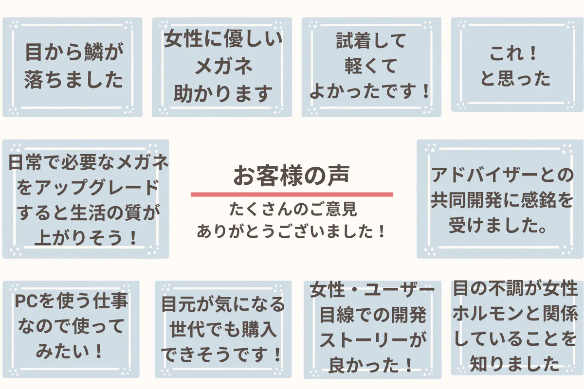 私たちがつくるのは、ただのメガネではありません。毎日をがんばる大人の女性が、「自分らしく、心地よく、美しく」いられるための一本です。私たちの想いに共感していただけたら、ぜひ応援のほどよろしくお願いいたします!