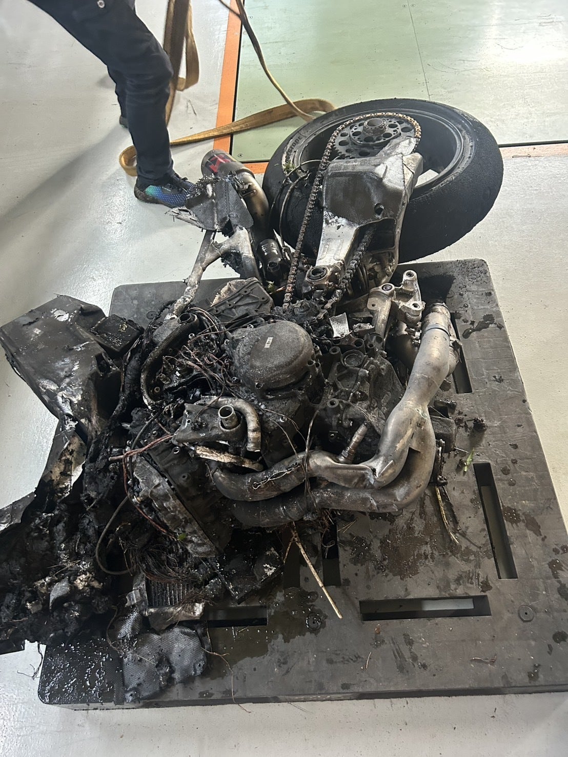 ※実際のバイクが炎上し、消火活動している時の様子とピットに帰ってきた時のマシンの姿
