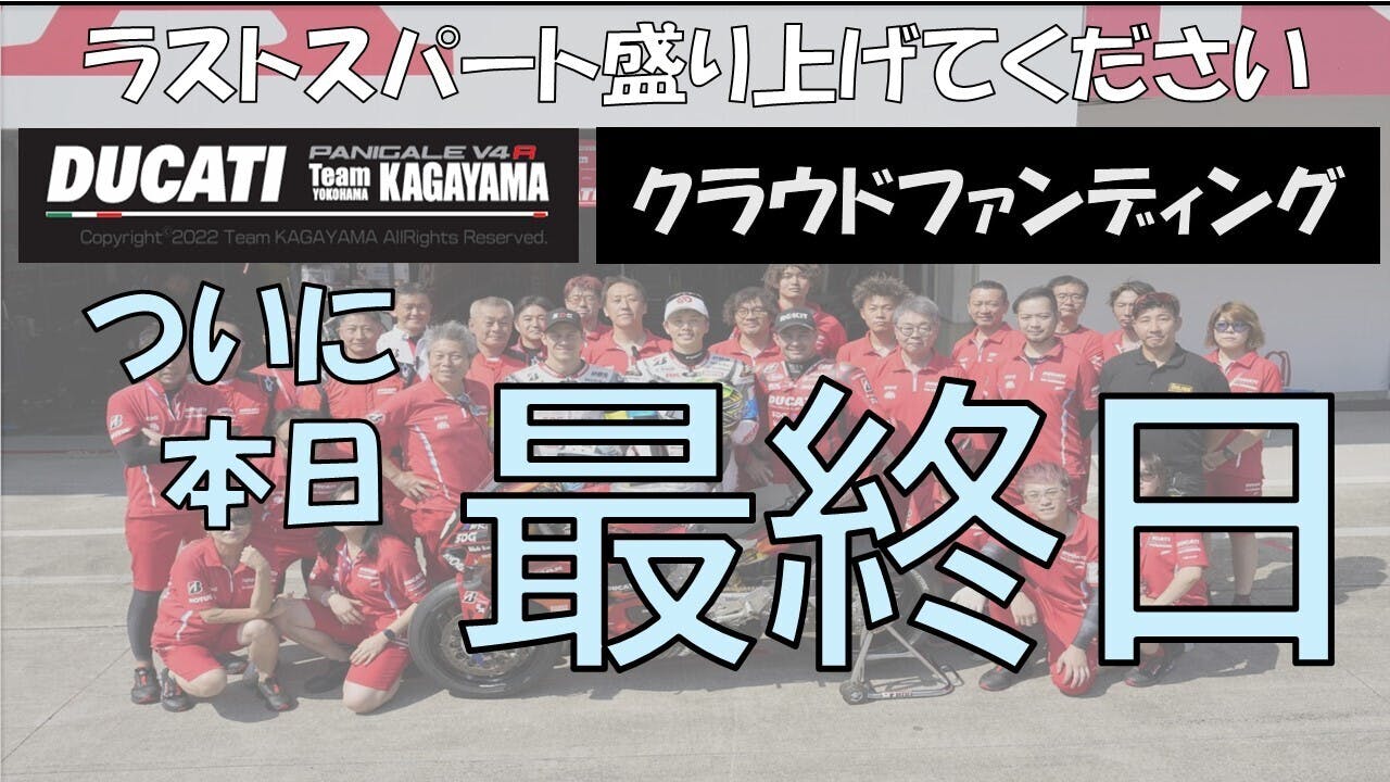2025/08/10 09:00DUCATI Team KAGAYAMAにご支援くださっている全ての皆様そして私たちの挑戦を見守ってくださる皆様へついに、私たちのクラウドファンディングは、本日、最終日を迎えます。この数ヶ月間私たちは皆様と共に、想像を超える困難を乗り越え、そして夢を追いかけてきました。開幕戦での劇的な優勝その直後に起きた、マシンの全焼という絶望的なアクシデントエースライダー水野涼選手の両肩骨折という試練それでも、私たちは諦めませんでしたそれは730人を超える皆様からの温かいご支援と数えきれないほどの熱い応援メッセージがあったからです皆様の「応援したい」という強いお気持ちが私たちに再び立ち上がる勇気を与え鈴鹿8時間耐久ロードレースの舞台に立つことを可能にしてくれました。結果は29位と、目指した順位には届かなかったものの皆様と共に「完走」という大きな達成感を分かち合うことができました。本当にありがとうございました。「復活」の、その先へ――全日本ロードレース選手権鈴鹿8耐での戦いを終え、私たちは既に次なる舞台へと目を向けています。来る8月22日からは2025年MFJ全日本ロードレース選手権シリーズが始まります。鈴鹿8耐での経験と悔しさをバネにDUCATI Team KAGAYAMAは「優勝」という頂点を目指し全身全霊をかけて準備を進めています。私たちの挑戦は、皆様の支えなしには決して成り立ちません。高性能なレーシングマシンを維持し、最高の状態でレースに挑むためには、多大な費用が必要です。皆様からのご支援は、チームの運営費、マシンの開発費、選手のサポート費用などすべてがDUCATI Team KAGAYAMAの未来を創る大切な力となります。これが最後のチャンスです!皆様の「ひと押し」を!本日が、クラウドファンディングにご支援いただける最終日です。皆様の応援が、私たちの勝利への道を切り開きます。たとえ少額のご支援でも、その一つ一つがチームにとってかけがえのない力となります。DUCATI Team KAGAYAMAはこれからも「黒船襲来」の精神で、日本のモータースポーツ界に新たな風を吹き込み皆様に最高の感動をお届けできるよう、全力を尽くしてまいります。どうか、DUCATI Team KAGAYAMAの「復活」そして「優勝」への道のりを最後まで共に歩んでください!皆様の最後の「ひと押し」を、心よりお願い申し上げます。DUCATI Team KAGAYAMA 一同【皆様へのお願い】シェアしてプロジェクトを、そして私たちの夢を、もっと広げてください!このクラウドファンディングの存在を、まだご存じない方もいらっしゃるかもしれません。皆様がこの活動報告をSNSなどでシェアしてくださることでより多くの方に私たちの挑戦を知っていただくことができます。皆様のシェアが、私たちの最後の「ひと押し」となります。ぜひ、ご協力をお願いいたします! もっと見る