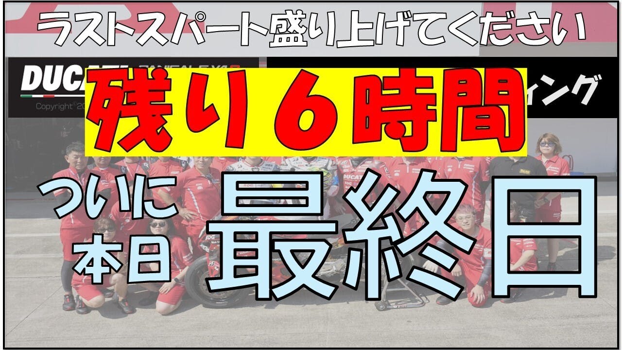 2025/08/10 18:00DUCATI Team KAGAYAMAにご支援くださる皆様ついにこの時が来ました。今まで2か月に渡りご支援とお付き合いを頂き本当にありがとうございました。クラウドファンディング終了まで、残りわずか6時間です!最後の活動報告になります。まわりくどい話はもうしません。どうか、皆様の**最後の「ひと押し」**DUCATI Team KAGAYAMAの未来に託してください!皆様と共に、最高の栄光を掴み取ります。熱いご支援を、何卒よろしくお願いいたします!DUCATI Team KAGAYAMA 一同 もっと見る