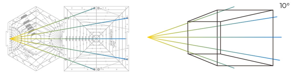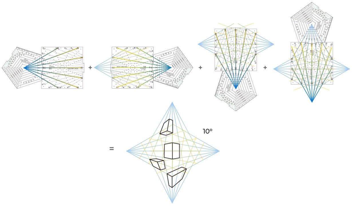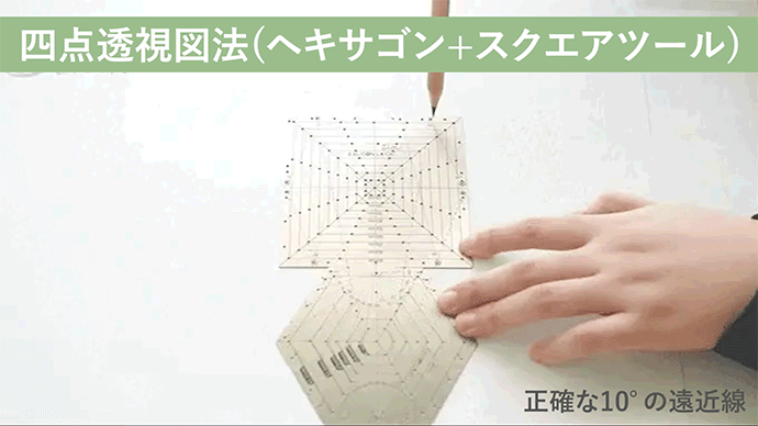 ヘキサゴンツールとスクエアツールを組み合わせて10°刻みの二点透視図法を描くことが可能!
