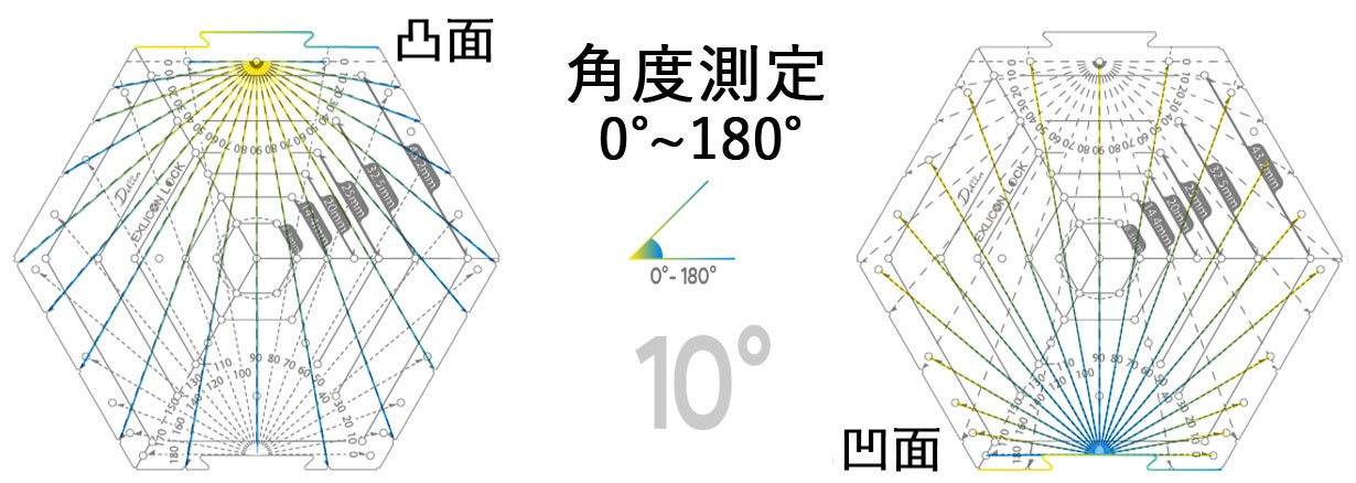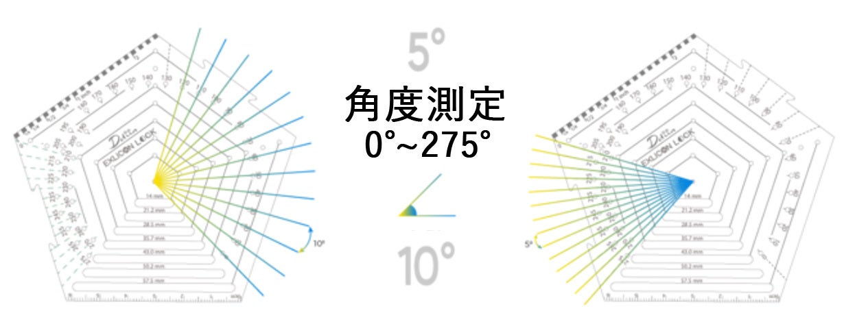1つのペンタゴンツールに2種類の分度器があり、0°から275°まで5°刻みと10°刻みで測定できます。