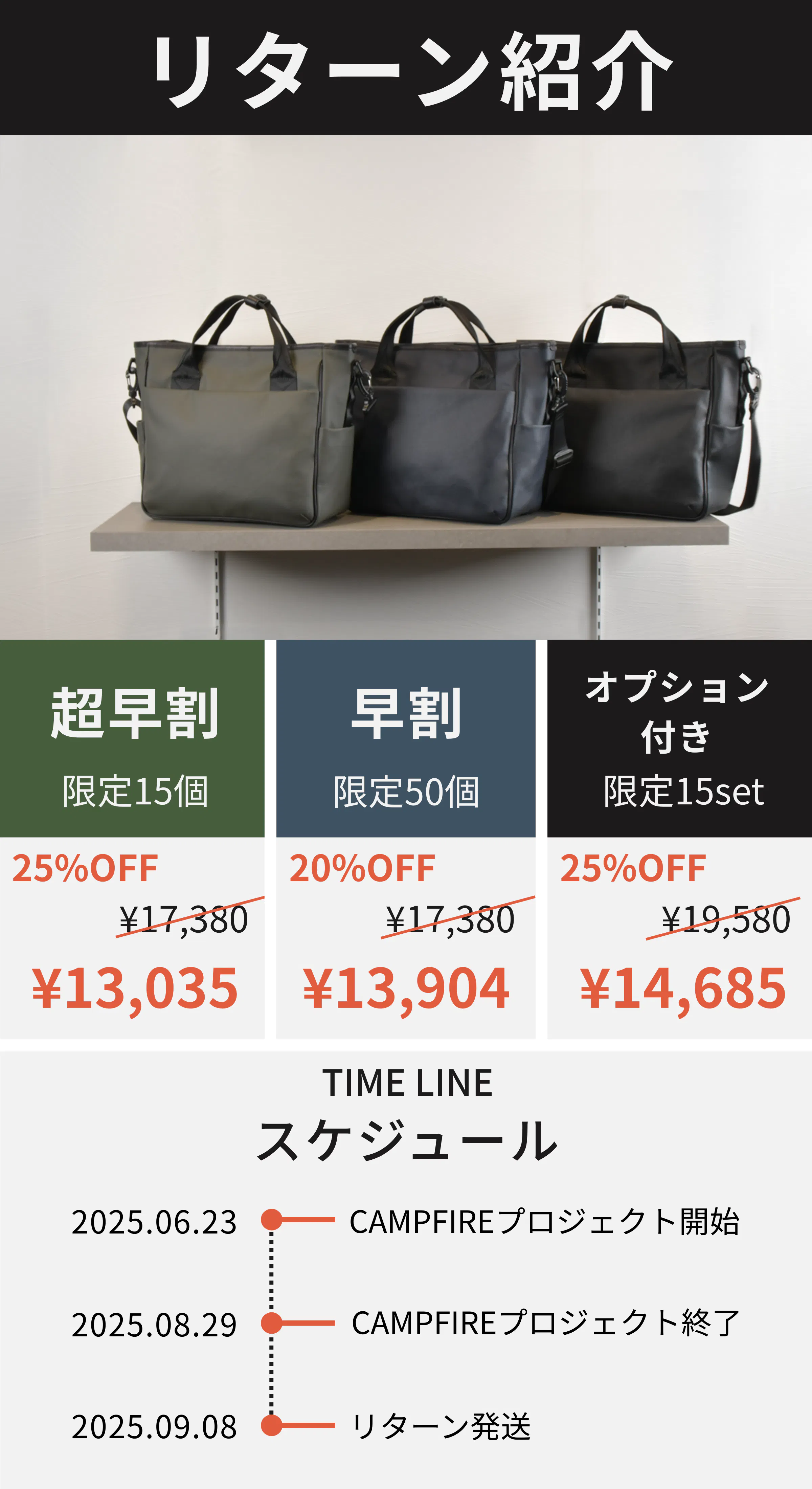 2025/08/30 14:13支援者の皆さま、お世話になっております!TRIDEAL運営の千坂です。昨日をもちまして、TOUGH SHOULDER MULTI TOTEのCAMPFIREでのプロジェクトが終了いたしました。あらためて、心より感謝申し上げます。今回のチャレンジを通して、商品や想いに共感し、応援してくださった皆さまの存在が、私たちの大きな励みとなりました。皆さまからのご支援、本当にありがとうございます!本日はリターンの出荷についてご案内をいたします。リターンは、 9/8に大阪にある弊社の倉庫から佐川急便を使って出荷予定です。倉庫には、9/3にお届け先情報を共有する必要がありますので、もし購入時からお届け先に変更がある場合は、9/2までにに変更手続きをお願いいたします。TIMELINE8/29 プロジェクト終了9/2 お届け先変更手続き期限※変更なしの方は何もする必要ありません。9/3 お届け先情報を倉庫に共有※これ以降のお届け先変更は対応致しかねますので、ご注意ください。9/8 リターン発送お客様のご都合により商品が再配達になった場合は、着払いにて再発送いたしますので予めご了承くださいませ。それでは、皆さまにお届けできるその日まで、心を込めて取り組んでまいります。今後とも、どうぞよろしくお願いいたします。TRIDEAL 千坂 もっと見る