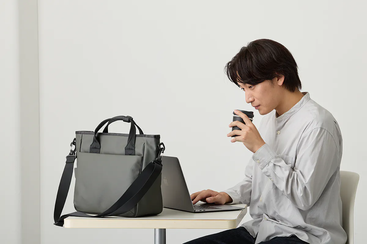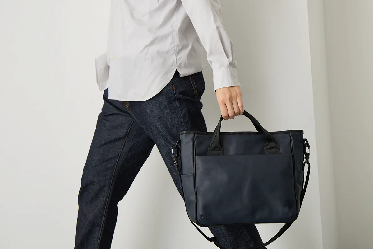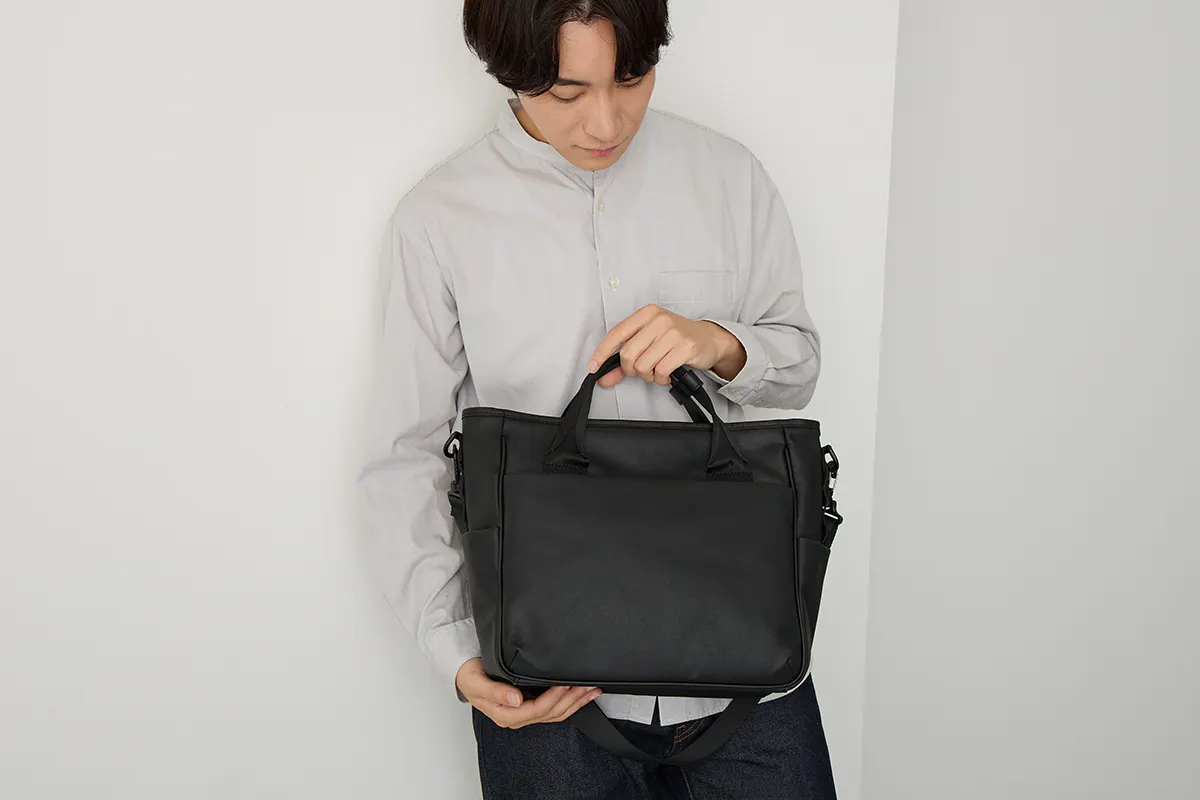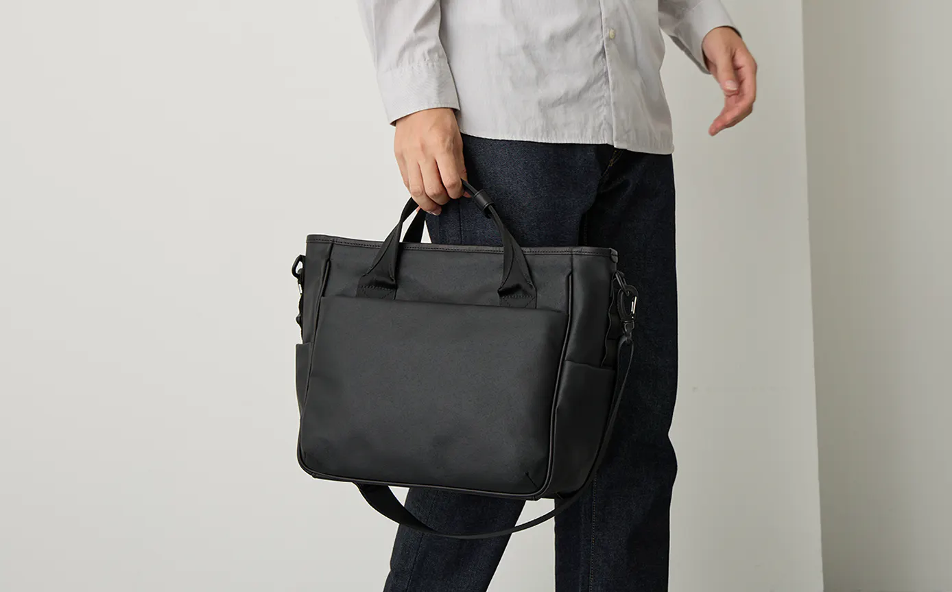 手持ちでも、クロスショルダーでも持てるTOUGH SHOULDER MULTI TOTEは、必要な荷物を無理なく収納し、オフィスカジュアルにも自然に馴染むミニマルなデザインで毎日の通勤にも活躍します。