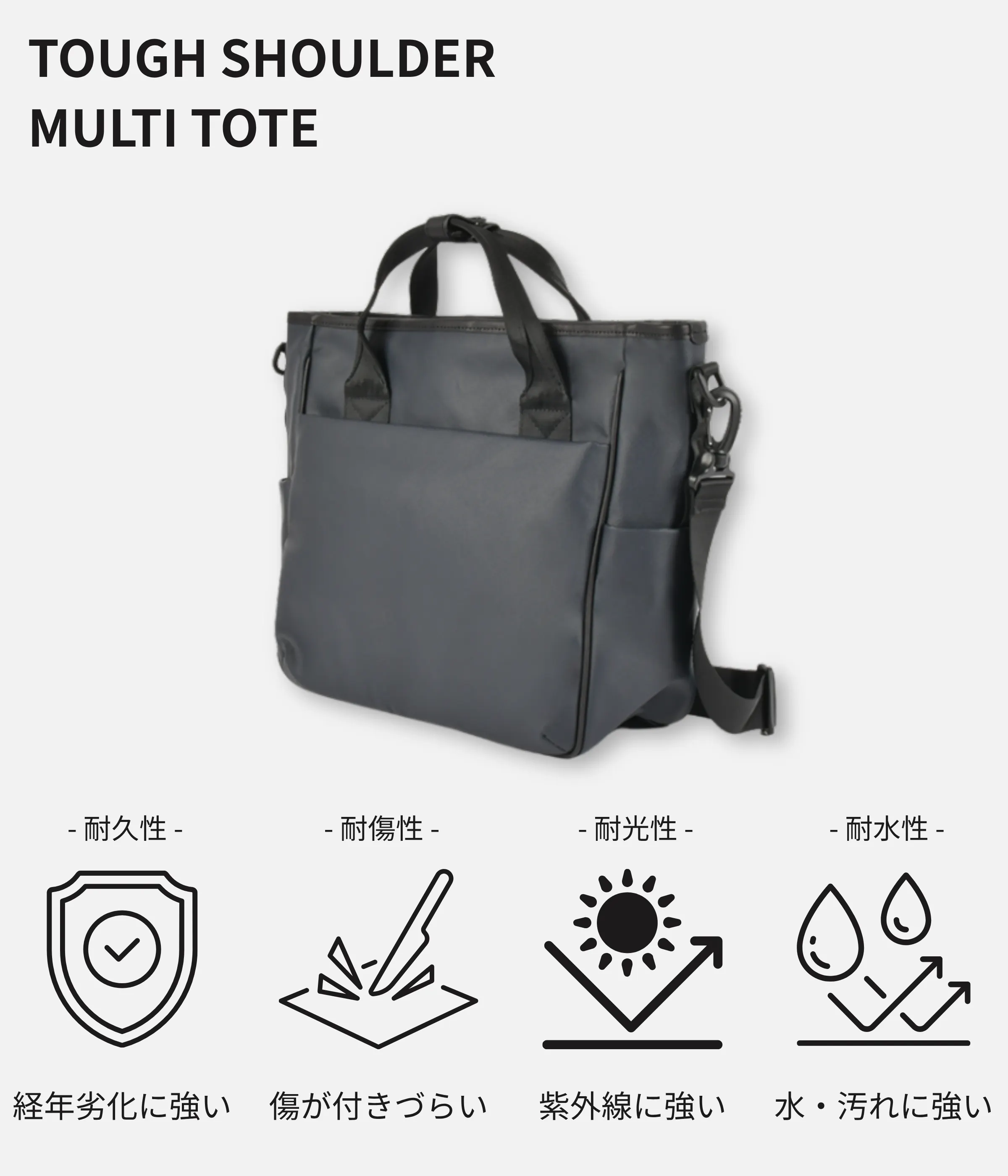そんな思いから、「いつまでも色褪せない、長年綺麗に使えるトートバッグ」をコンセプトに、TOUGH SHOULDER MULTI TOTEを開発しました。