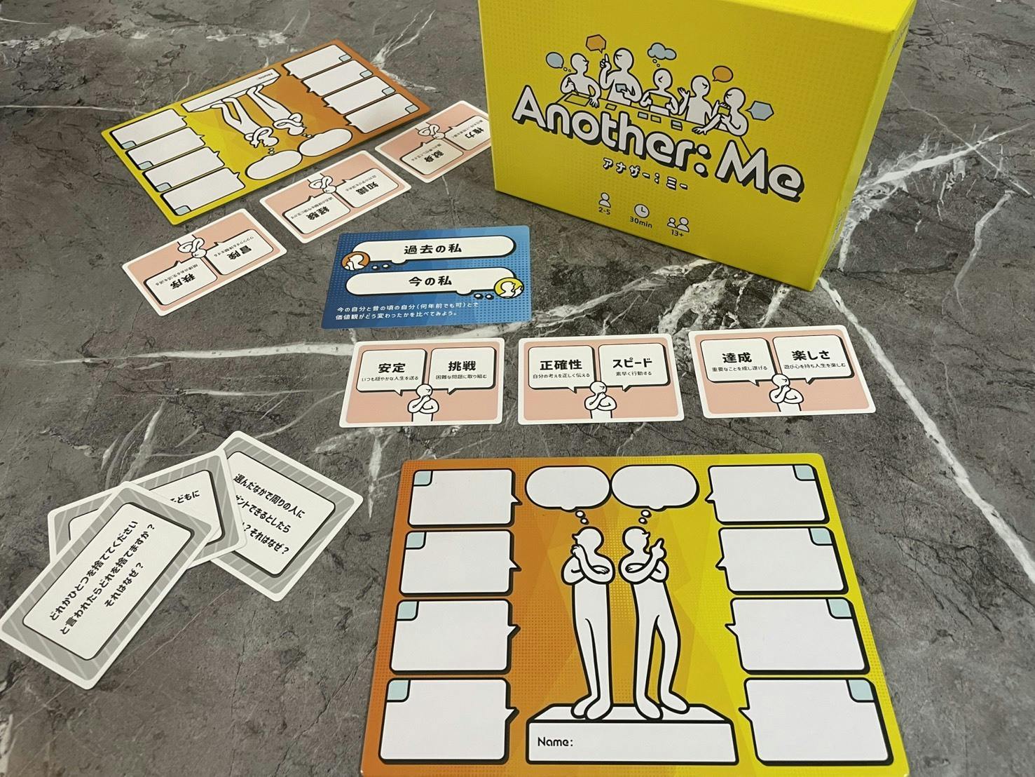 『Another: Me(アナザー・ミー)』は、プレイヤーそれぞれの価値観を「物語に乗せて」対話を行うコミュニケーションゲームです。自分の価値観を様々なキーワードで比較していくことで進行していきます。