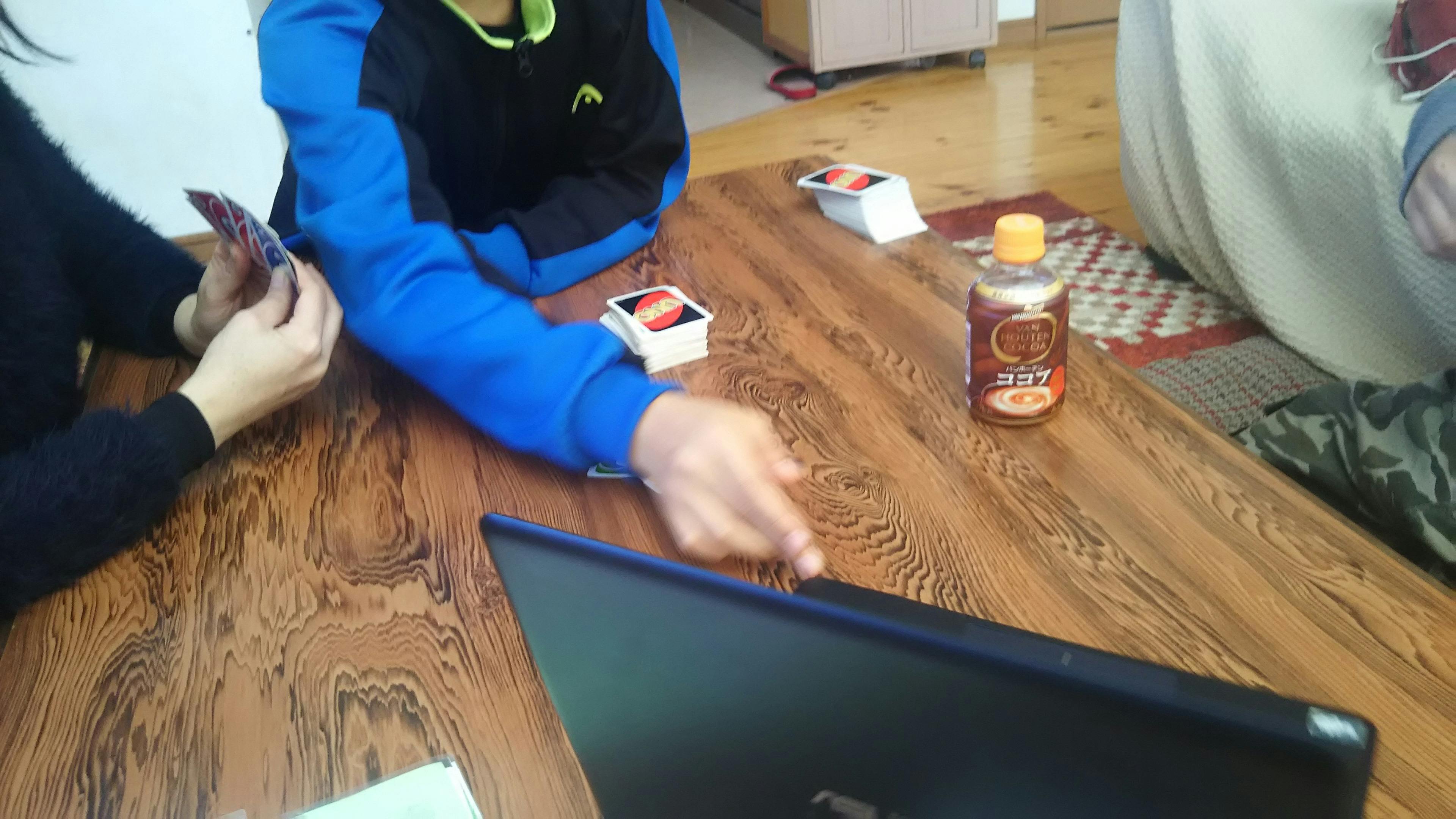 (埼玉のホームスクーラーとZOOMを使い、UNOをやっています。数字が反転してしまうことや、代理で手札を出す人を置いたりと、工夫します。)