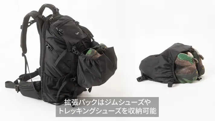 これにより旅行移動時やトレッキングではウエストベルトや拡張パックを使用、街の散策時はウエストベルトを取り外し容量を小さくして身軽に散策といった使用方法が可能です。