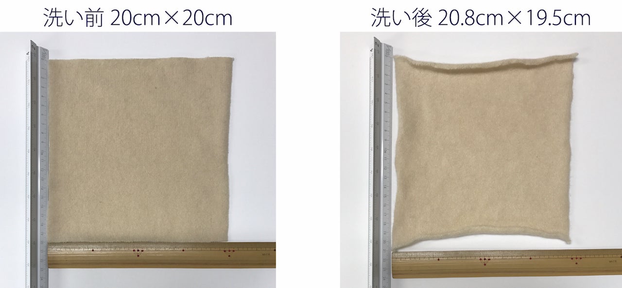 洗濯前:縦20cm×横20cm→洗濯後:縦20.8cm×横19.5cm