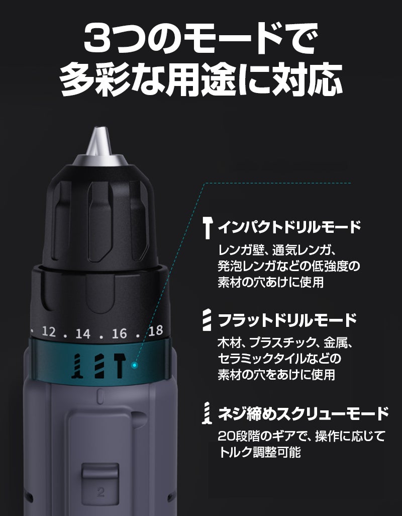 さまざまな状況や用途に対応するモードと、トリガーを引く強さで回転速度が調整できる無段階変速機能で作業をスムーズに行えます。