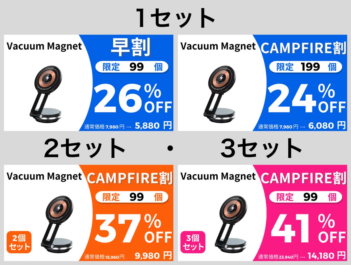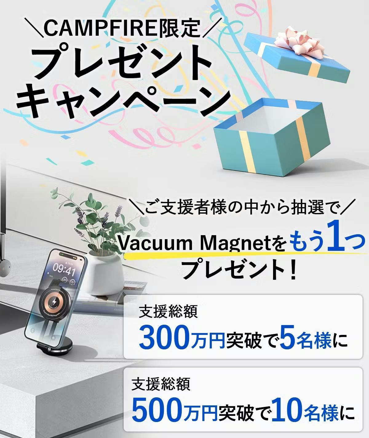 大好評をいただき大成功したVacuumシリーズを記念して、CAMPFIREだけの購入者限定プレゼントキャンペーンを実施します!ご支援者様の中から抽選で当たった方に、なんとVacuum Magnetをもう1つプレゼント!!