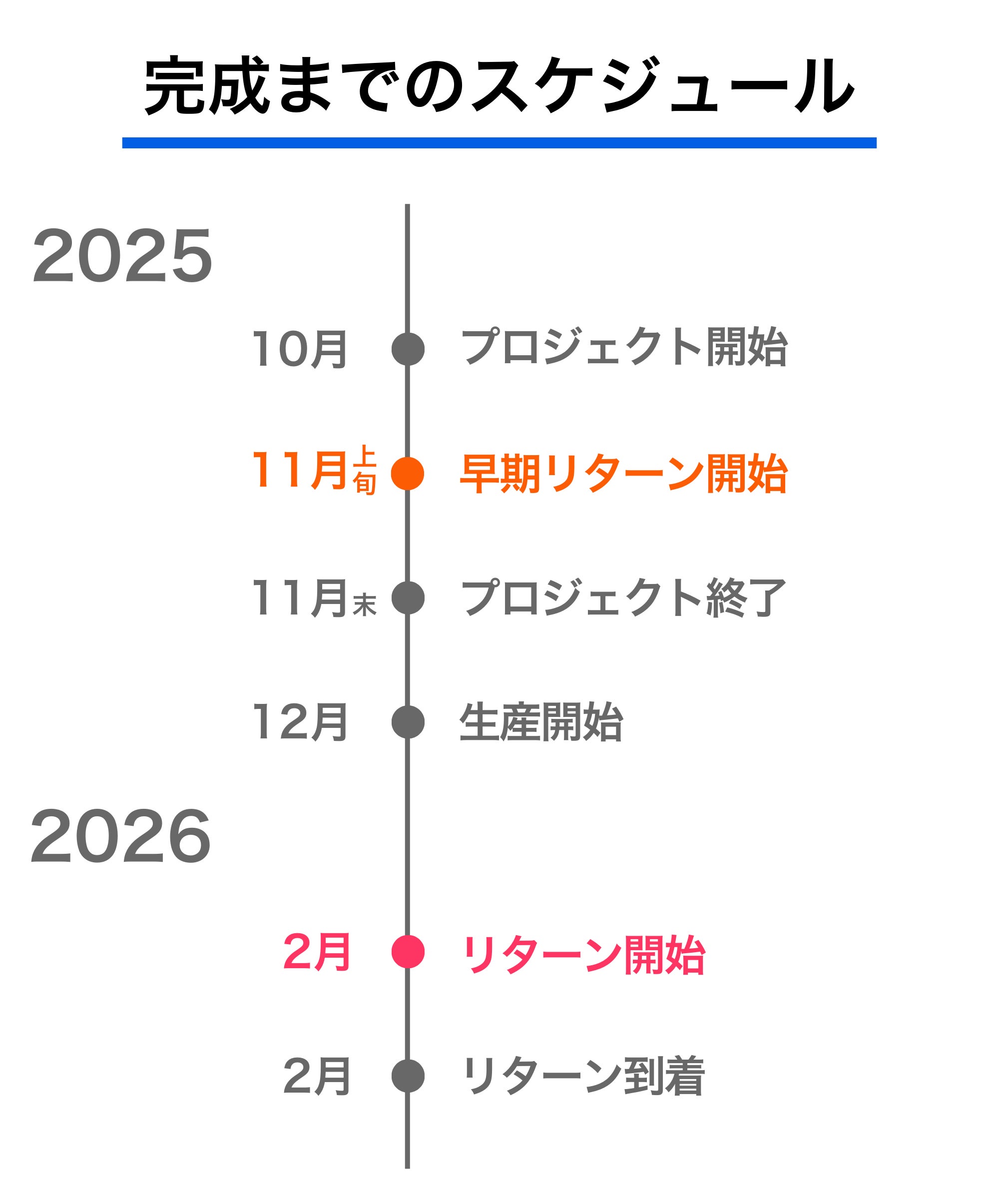 ※本文中に記載させていただいたスケジュールは、あくまでプロジェクト公開時点の予定です。クラウドファンディングの性質上、配送遅延のおそれがございます。