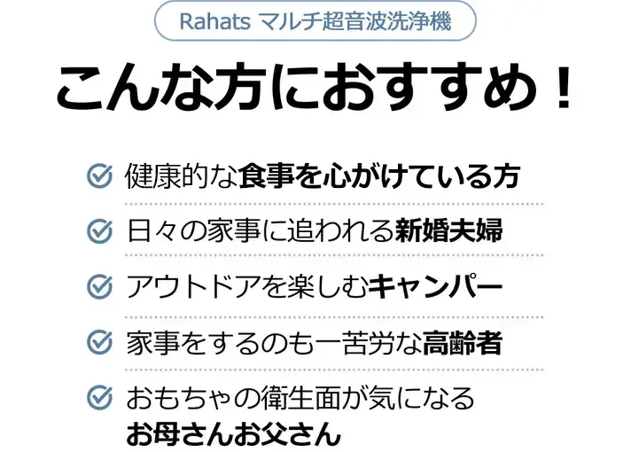 その中でも特に洗浄というのが大きな比重を占めてはいませんか?そんな負担を少しでも軽くできるのが「Rahats マルチ超音波洗浄機」です。スポンジや手ではキレイに洗えないところまで細かく洗浄ができる超音波洗浄機を通して多くの方々が少しでも家事の負担から解放されるよう願っています。