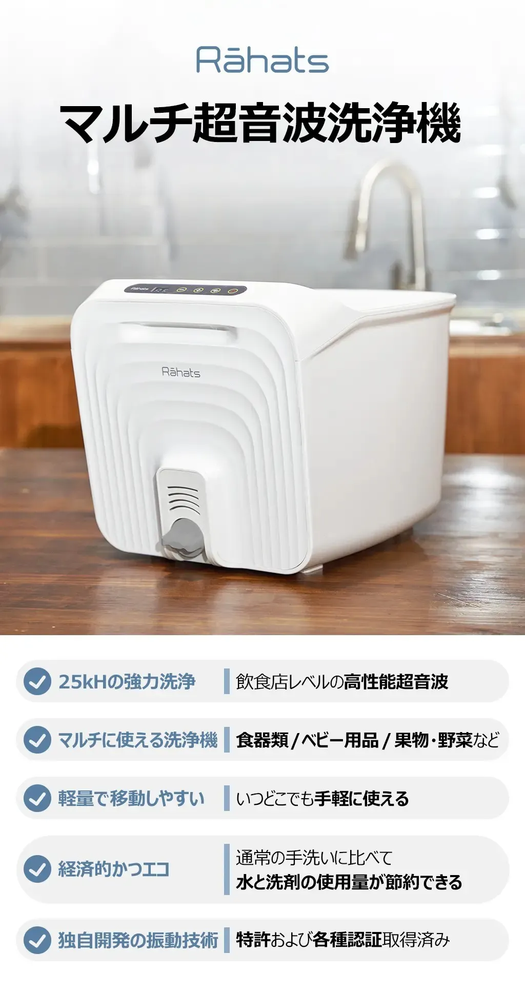 「Rahats」は、超音波洗浄機のメイン技術である振動子を独自で開発し、特許にも登録(韓国)されています。使用中の騒音も約50デシベル以下(静かなオフィス程度)です。