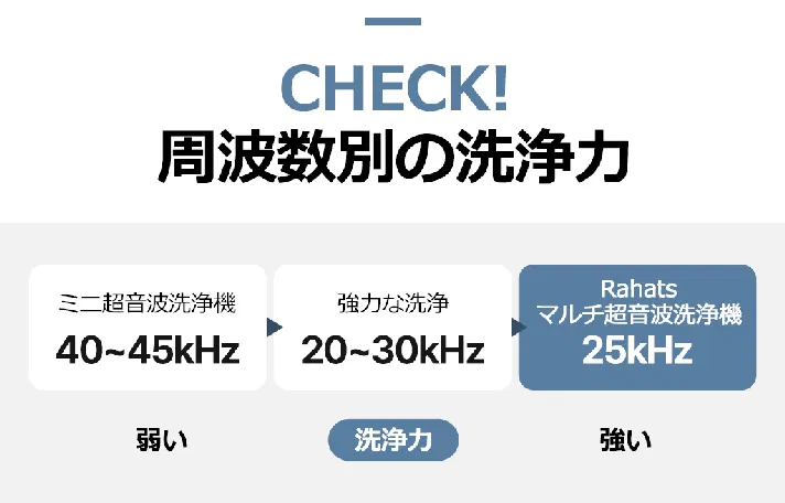 ※一般的な超音波洗浄機は振動子に水が当たるように水を満たしてあげる必要がありますが、Rahatsは振動子が本体下部にあるため、水の量を節約することができます。