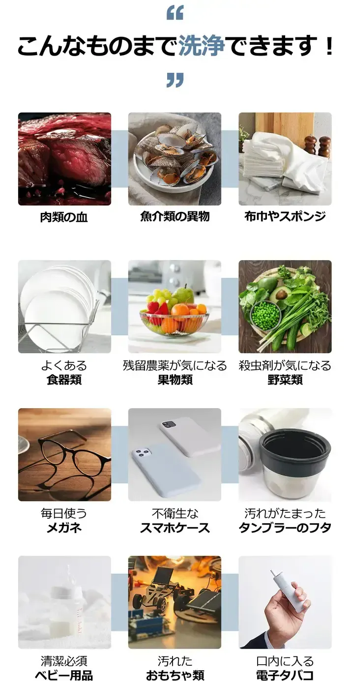 「Rahats マルチ超音波洗浄機」は、肉・野菜・果物といった食材の洗浄から、食器の洗浄まで可能です。また、メガネや歯ブラシ、剃刀のような小物や、レゴのような子どものおもちゃ、アクセサリー、タンブラーのふたの汚れなど細部の洗浄が難しい生活用品など、目に見えない細かな汚れにも効果的です。