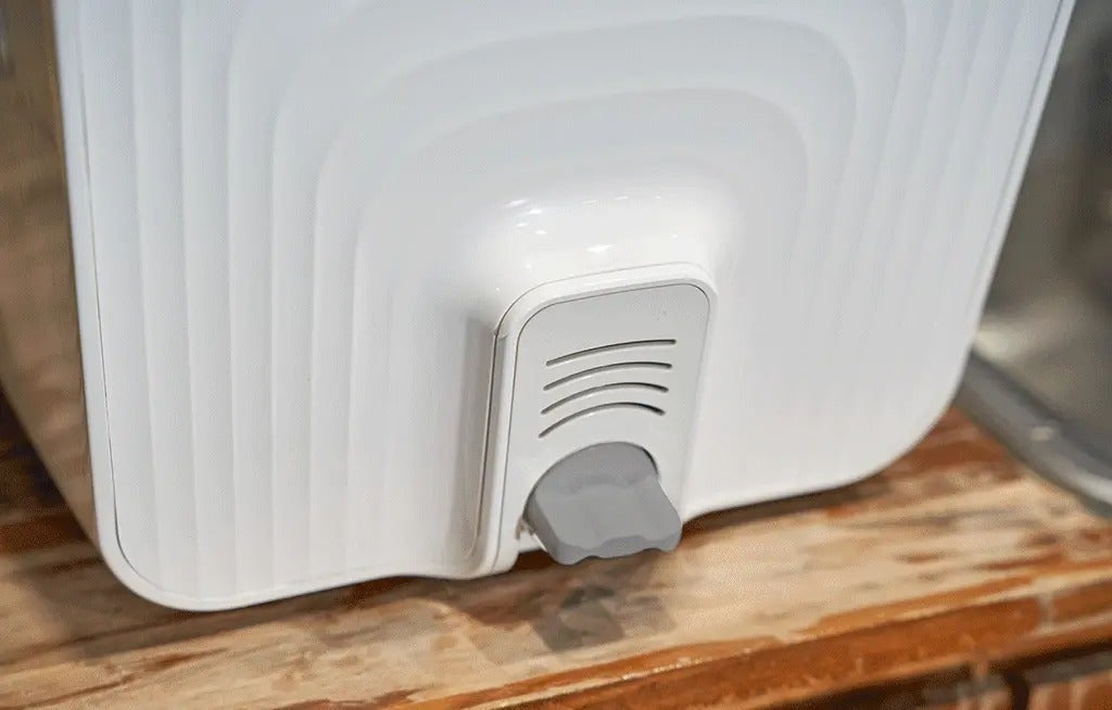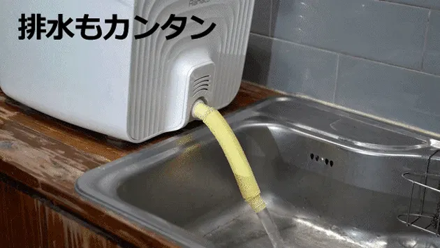 キャップを開いて簡単に排水可能!シンク台を上に置いて使用される場合は、洗浄機の向きに関係なく、排水延長ホースを使ってラクに排水ができます。