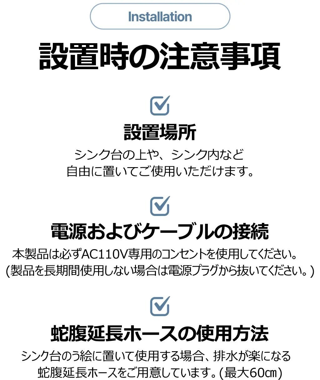 ・ベンゼン、シンナー、ガソリンなどの可燃性物質が付着した食器は洗わないでください。爆発や火災の危険があるため、可燃物容器を洗浄槽内に保管しないでください。・食材と小物類、食器類を同時に洗浄しないでください。・故障の恐れがあるため、本体のボタン部分、および本体正面にある空気循環口から本体内部に水が浸入しないようご注意ください。・電気ストーブ、ろうそく、蚊取り線香などの火気を近づけないでください。プラスチック部品が熱により変形したり、コード被覆が溶けたりして火災、感電の原因となります。・感電や故障の恐れがあるため、お子様が操作しないようにご注意ください。・雪や雨風にさらされる場所や、床、水が溜まりやすい場所、または腐食性ガスのある場所にて設置、および使用をしないでください。・製品を長期間使用しない場合は、電源プラグを抜いて保管してください。・傷口に影響はありませんが、手指に傷がある場合は、超音波により痛みが生じることがあるため、水中に素手を入れないでください。・使用時は必ず本体に水を貯めた後に電源を入れて使用してください。・長時間使用すると、溶存酸素が除去され、超音波がより強力になるため、通常よりもノイズが大きくなる場合があります。 (洗浄力はより優れています)