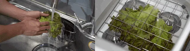 A、排水口の穴のサイズは20mmと大きめに設計されているため、スムーズに排水可能ですが、野菜を洗浄する際に(特にもやしなどの小さな食材)残留物が水の流れに乗って排水口に吸い込まれることがあります。そういった場合も、排水口の長さが短いため、指で簡単に取り除くことができます。