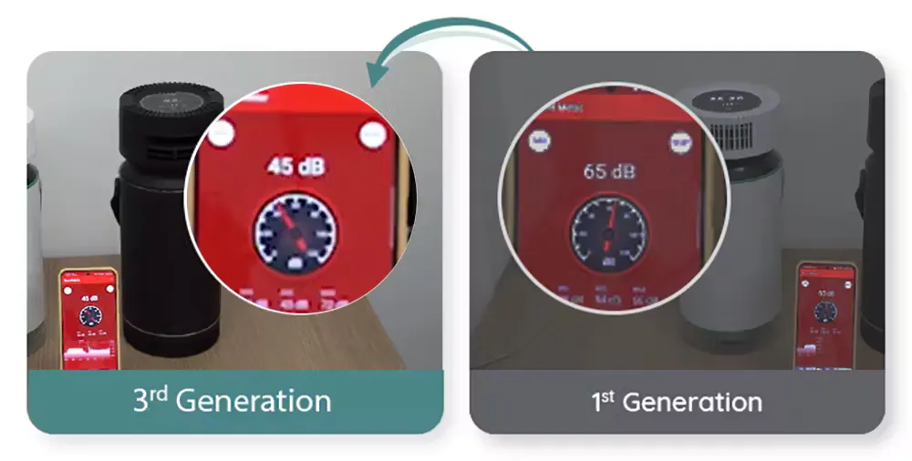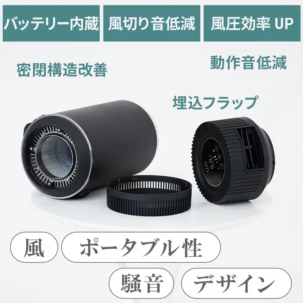 プロペラ式の扇風機とは異なり、吸気と排気を行うシロッコファンを採用しています。シロッコファンは動作音が弱点ですが、ファンを新規開発して機械音を低減し、風きり音を減らす構造で大幅にノイズを減らすことに成功し、一般的な扇風機レベルまでノイズを下げることができました。