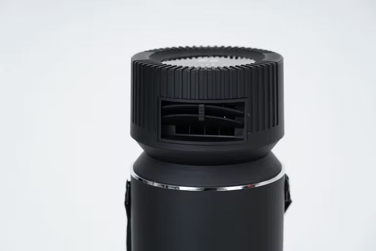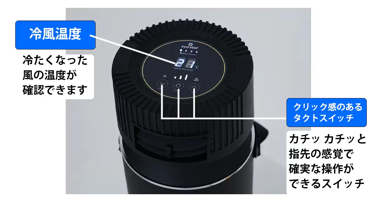操作パネルは現在の風量と温度が確認できます。温度計は現在出力されている冷風の温度が表示されます。温度を見て冷風を確認できるのも気持ち的にも涼しくなります。電源スイッチや調整スイッチは微妙な凹凸感のあるスイッチで、カチッ、カチッとクリック感が気持ちいいタクトスイッチを採用しています。暗闇でも確実な操作が可能になりました。