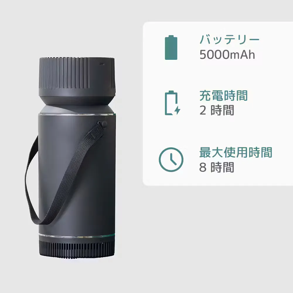 バッテリー内蔵で屋外でも車内でも使用可能になりました。屋内でも電源の取り難いキッチンやトイレ、脱衣所で使用出来ます。一度の充電で約8時間使用が可能です。
