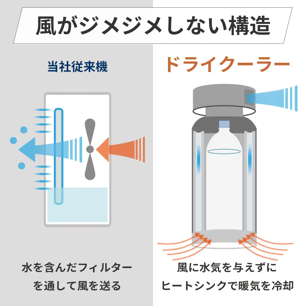 ドライクーラーは水と風の通り道が隔離されて湿気を増やさない
