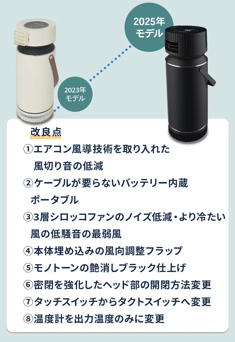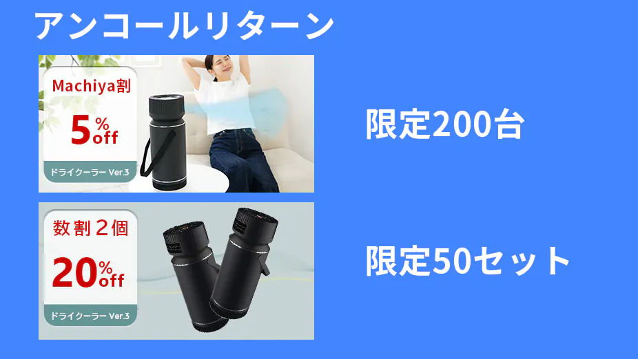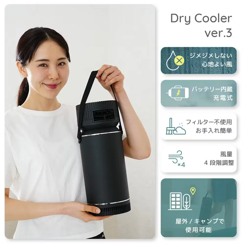 ドライクーラーは改良を重ねてVer3となりました。騒音、風、ポータブル性、デザインまでもが改良された新モデルです。