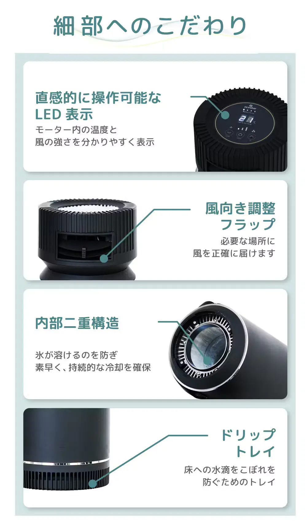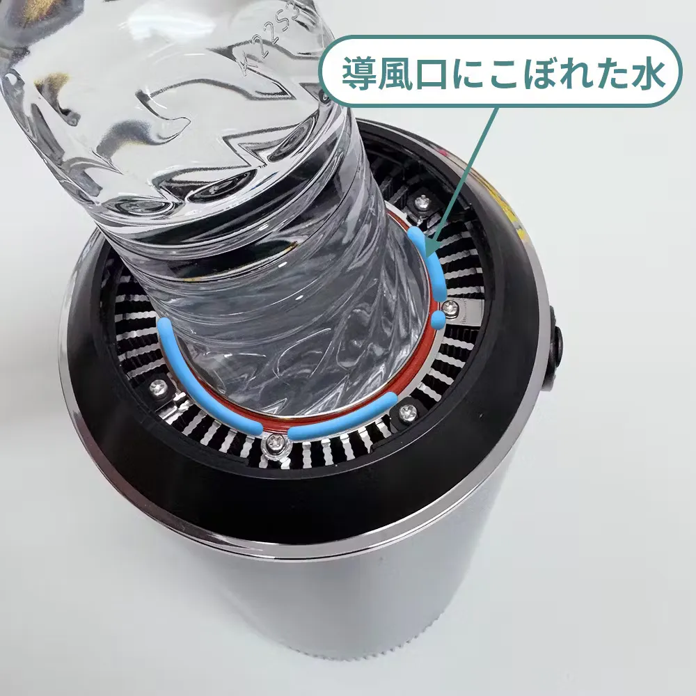 ペットボトルを入れた時、水を注入した時などの際、万が一水が冷風が通る部分に水が浸入しても下端のドレインキャップに溜まって床を濡らすことがない工夫されています。