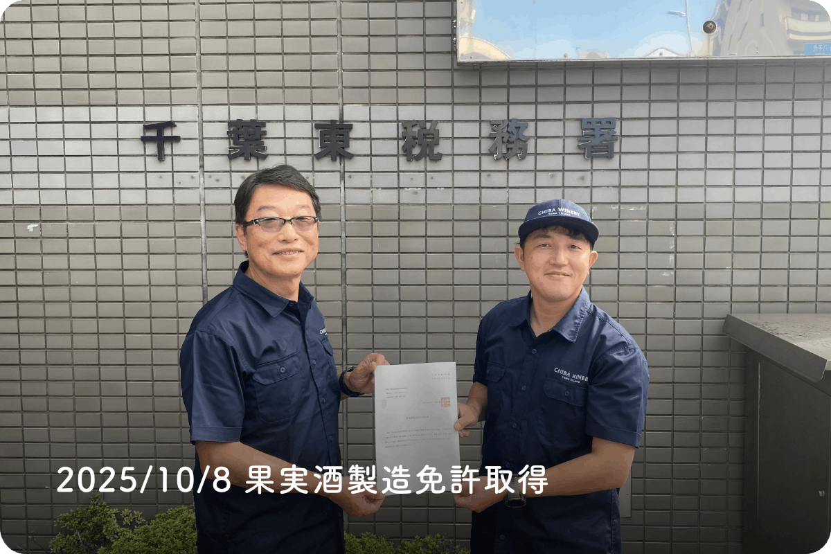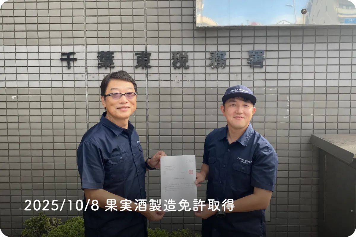 そして2025年の秋、皆様の想いを受けてワイナリーは産声を上げ、醸造免許を取得しました。千葉の土で育ったブドウが、千葉の醸造所でワインになる。この街で初めての物語が、いよいよ幕を開けます。