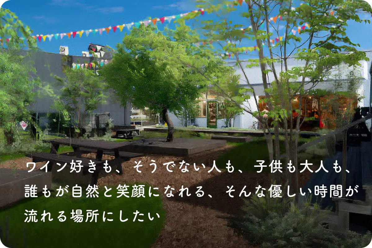 ワインは、その土地の人々に愛されることで、ブドウの樹のように深く根を張り、日々の暮らしや食文化と結びついていきます。だからこそ私たちは、ワインを通じて、誰もが楽しめる文化を育みたい。ワイン好きも、そうでない人も、子供も大人も、誰もが自然と笑顔になれる、そんな優しい時間が流れる場所にしたいのです。