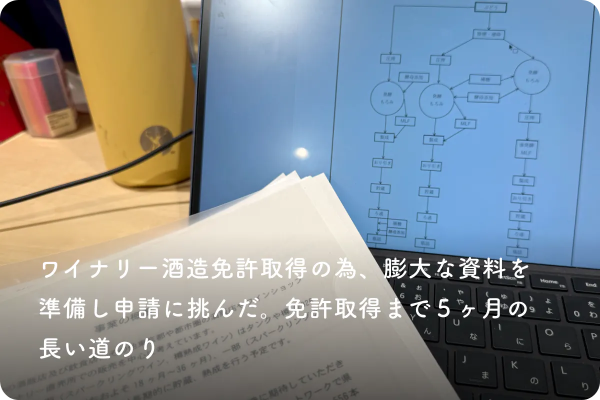 ワイン造りは国税庁の許認可が必要な事業の為、その書類整備や申請業務も半年近い時間をかけて膨大な資料を準備し申請を行いました。