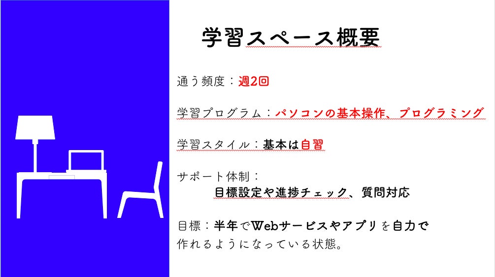 ①パソコンとプログラミングを学べるスペースを提供し、ITのスキルを身につけてもらう。