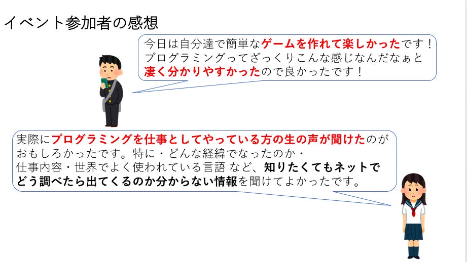 ・未経験の高校生にもプログラミングに興味を持ってもらうために、現役のエンジニアを招いてプログラミングの体験イベントを2度実施し、アンケートではプログラムに参加したいという声をいただいています。