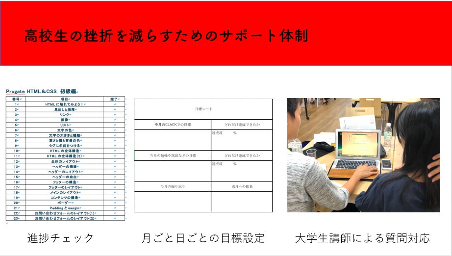 また、対象の高校生のプログラミング学習での挫折を減らすために以下の3つの工夫をしています。