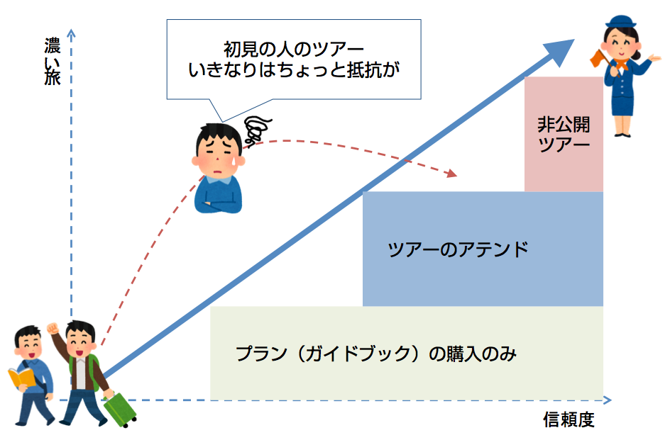 トラベラーにとっては「アテンダー」のサービスを気軽に使うきっかけとなり、アテンダーにとっても自信のある旅程プランを体験してもらうことで、自分自身に興味を持ってもらうきっかけとなります。