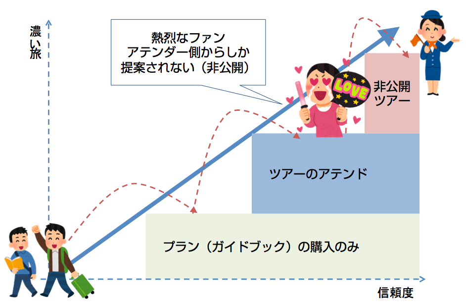 そして、アテンドされる旅行がどんどん楽しくなり、いくつも旅行にアテンドしてもらうと、そのアテンダーさん自体が好きになると思います。すると、「○○県といえばあの人!」という自分の中のお気に入りのアテンダーさんが生まれるでしょう。