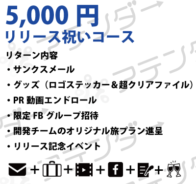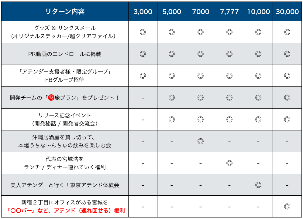 支援頂いた方はサービス公開前にいち早く触れ、意見が言える秘密のFBグループへご案内し、共に「アテンダー」を盛り上げてくれる仲間としてお付き合いさせて頂きたいと考えております。
