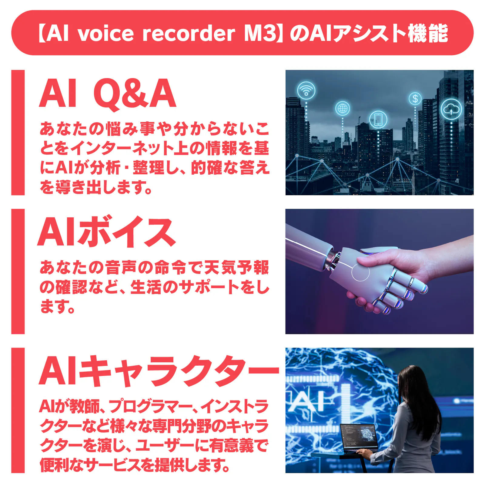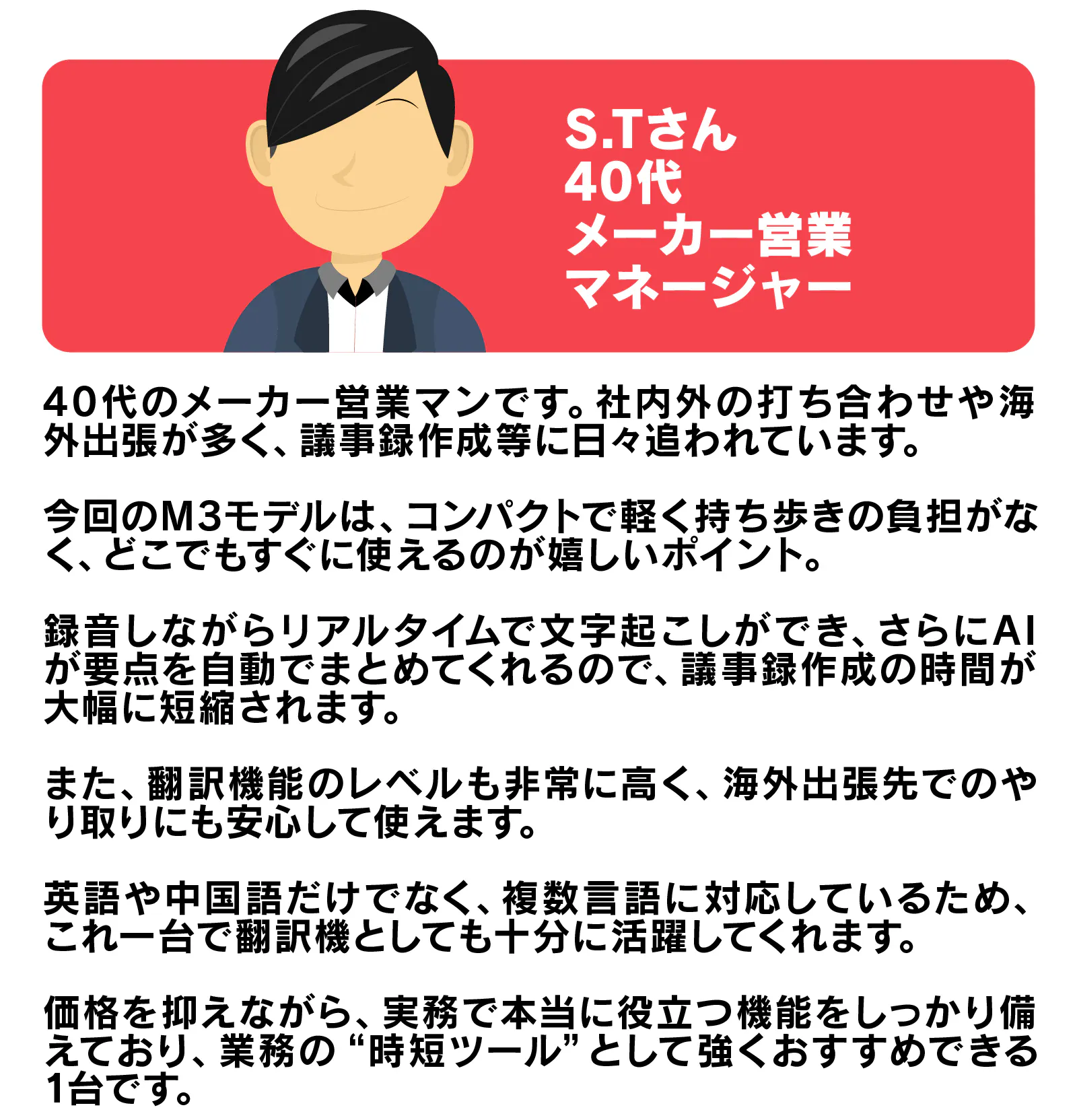 会議や商談、出張、講演など、さまざまなビジネスシーンで活躍する「M3」を通じて、誰もが手軽にAIの力を活用できる世界を広げていきたいと思っています。