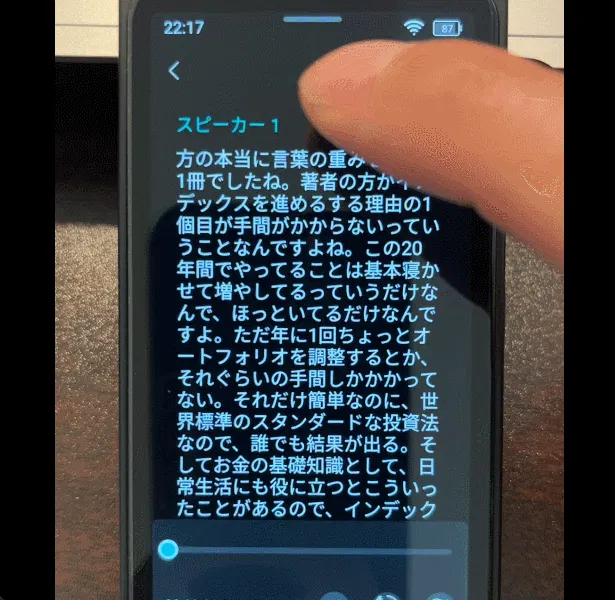 A:文字起こしの際のフォントの大きさは調整ができません。本製品はもともと画面が小さい(4.1インチ)ということもあり、スマホのように各画面の文字の大きさを設定することができません。