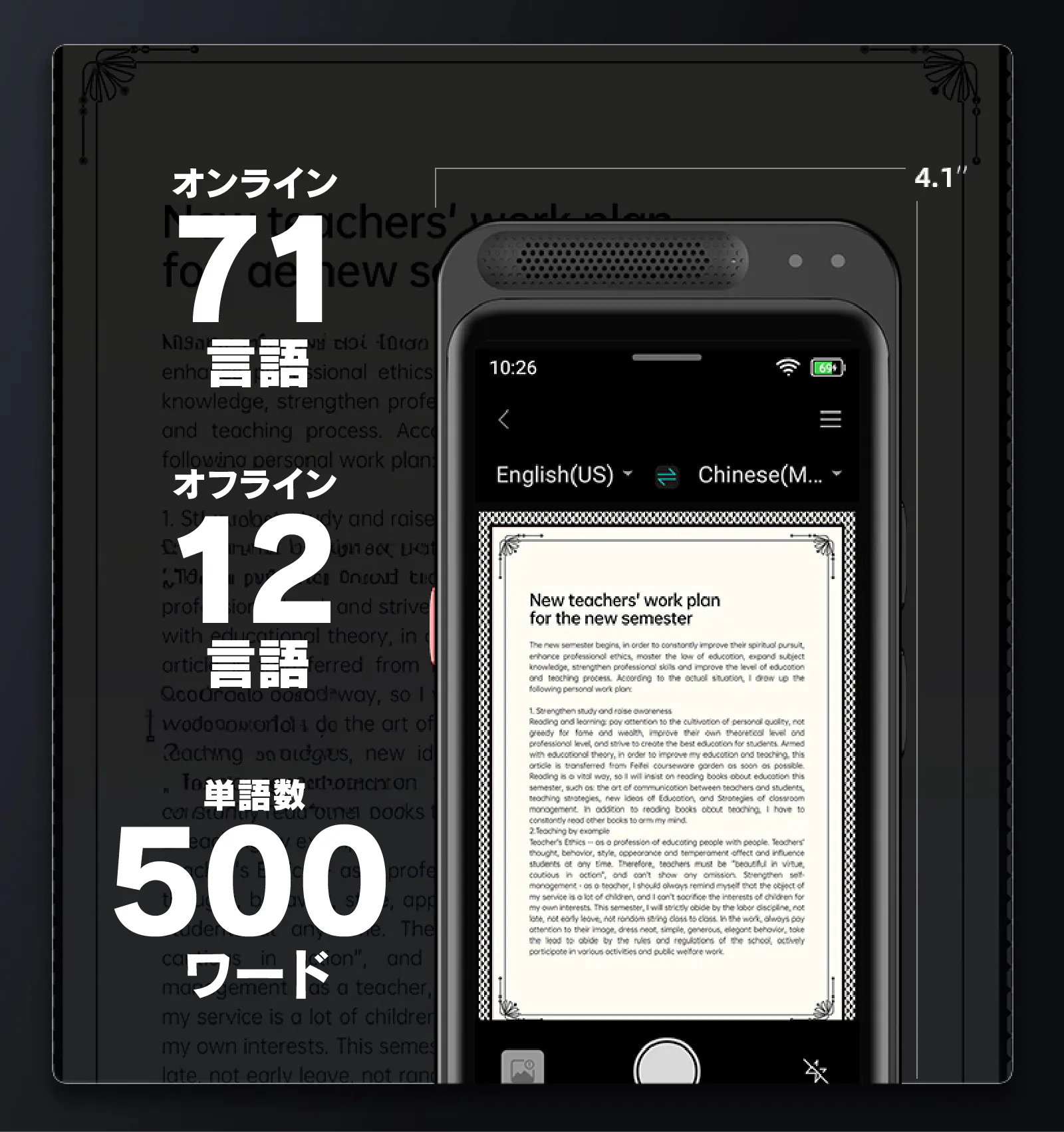 【AI voice recorder M3】のOCR翻訳ができる言語数はオンラインで71言語、オフラインでも12言語、さらに一度に認識できる単語数は何と500ワードにも上ります。