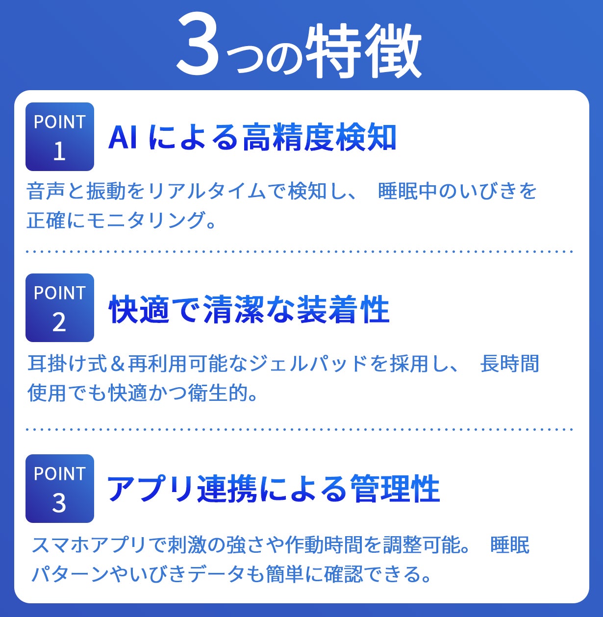 AIアルゴリズムでいびきや喉の振動を検知し、やさしいパルス刺激で筋肉をサポート。気道を広げるきっかけをサポートし自然な呼吸を促します。
