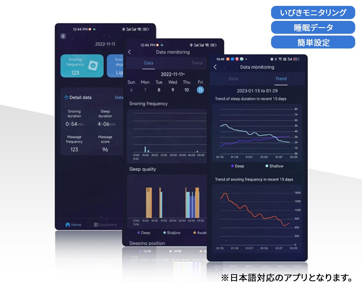 Sleepmiアプリでは、睡眠姿勢やいびきの長さ、効果の傾向などをわかりやすく確認でき、睡眠パターンを把握できます。