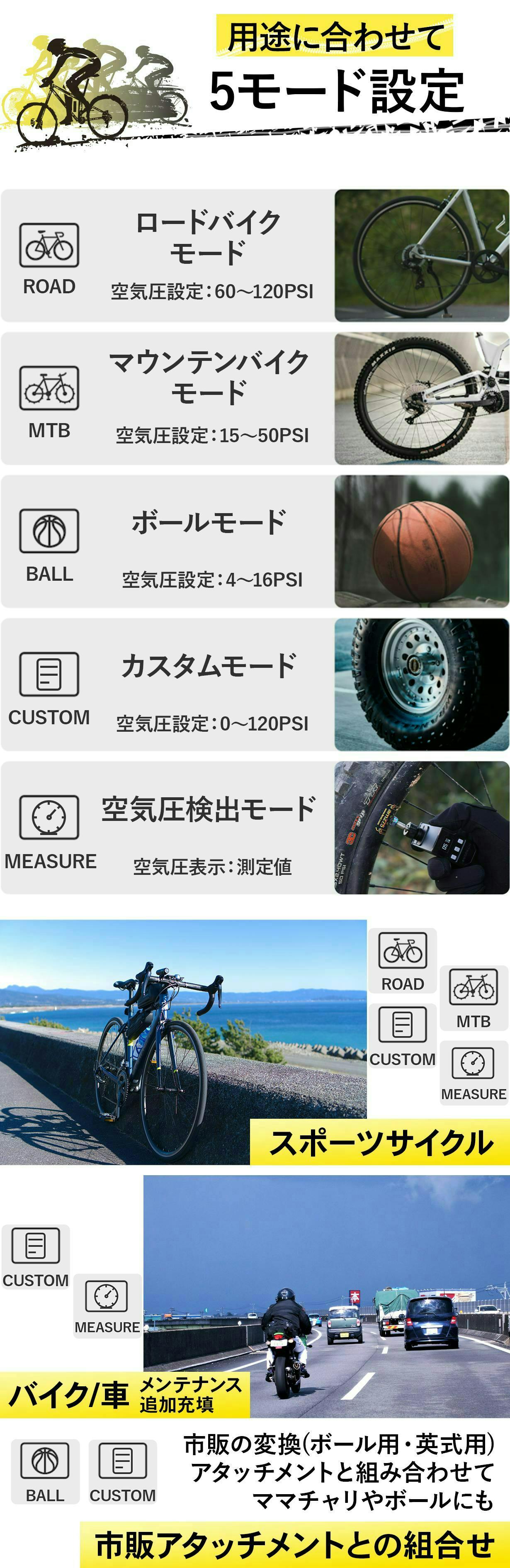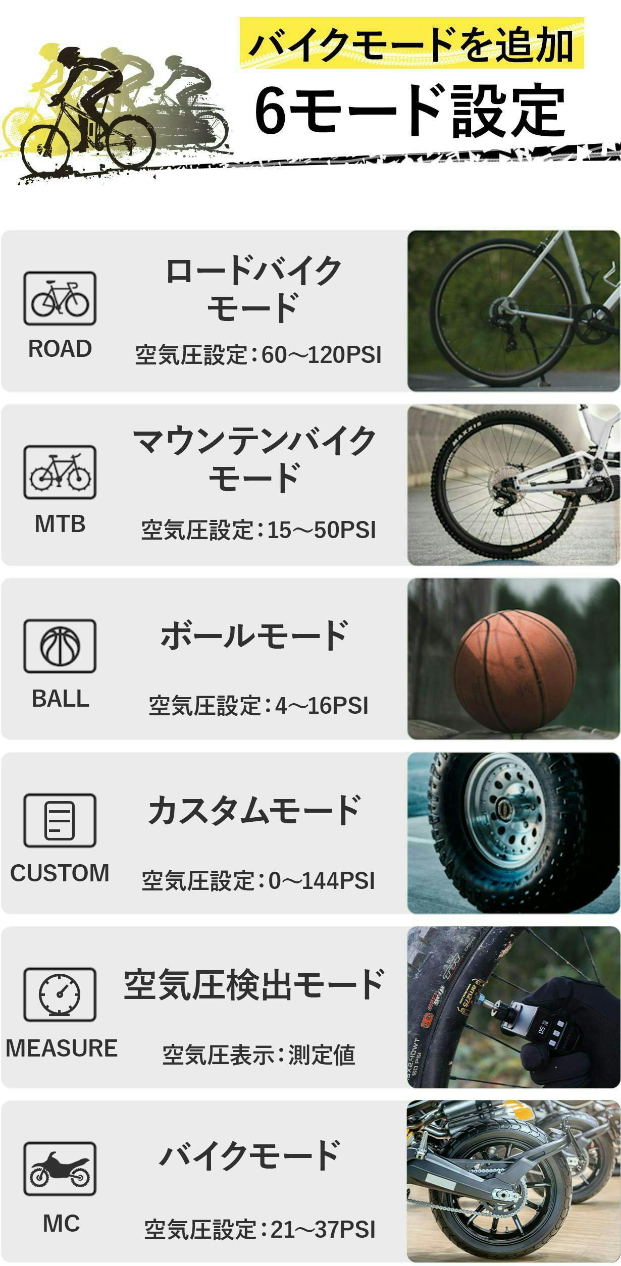 ディスプレイで空気圧の変化をリアルタイムで確認し、モードとボタンで空気圧をお好きな数値に設定できます。目標の空気圧に達した後、過充填を防ぐために自動停止します。