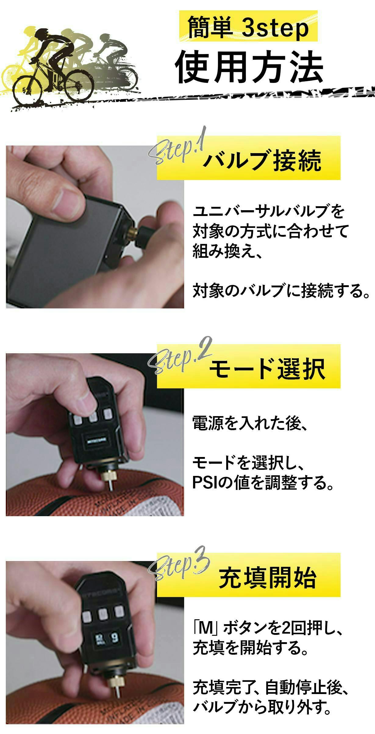 さらに市販のバルブ変換アタッチメントを組み合わせれば、ママチャリなどの普通の自転車や、スポーツボールにも空気を入れられます!