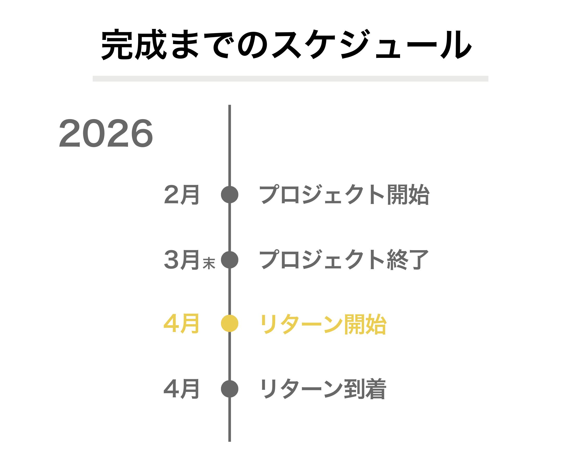※本文中に記載させていただいたスケジュールは、あくまでプロジェクト公開時点の予定です。クラウドファンディングを経て輸入を行う性質上、配送遅延のおそれがございます。